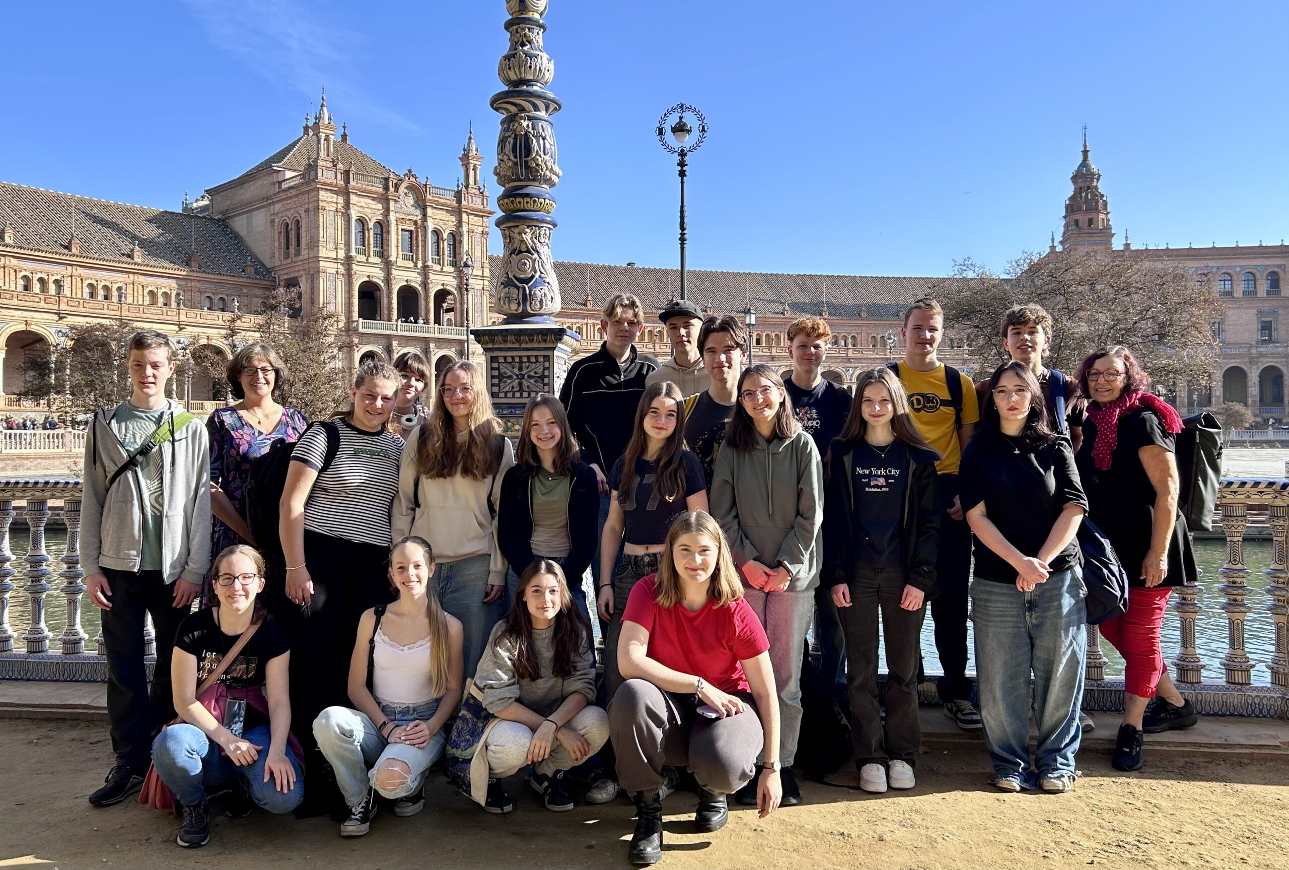 Wir fuhren bei 5 °C um 05.30 Uhr in Dresden los und wurden (nach einem ganzen Tag Reisen mit Zwischenstopp in Barcelona) mit über 15 °C Temperaturunterschied wärmstens in Sevilla empfangen. Geschlafen haben wir in dem sehr gastfreundlichen Hotel „Nuevo Suizo“, angesiedelt in einem netten alten Haus. Am ersten Tag unsere Reise hatten wir bis nachmittags Zeit, die Plätze und Gassen Sevillas zu erkunden. Maurische, gotische und barocke Hinterlassenschaften, wie z. B. die gotische „Catedral de Sevilla“ oder auch der kunstvolle Alcázar-Palast und der herrliche Plaza de España, aber auch moderne Sehenswürdigkeiten wie der „Metropol Parasol (Setas de Sevilla)“ („Pilze von Sevilla“), ließen uns staunen. Leider mussten wir, nach einiger schöner Zeit dort, weiter nach Badajoz, unserem eigentlichen Ziel.